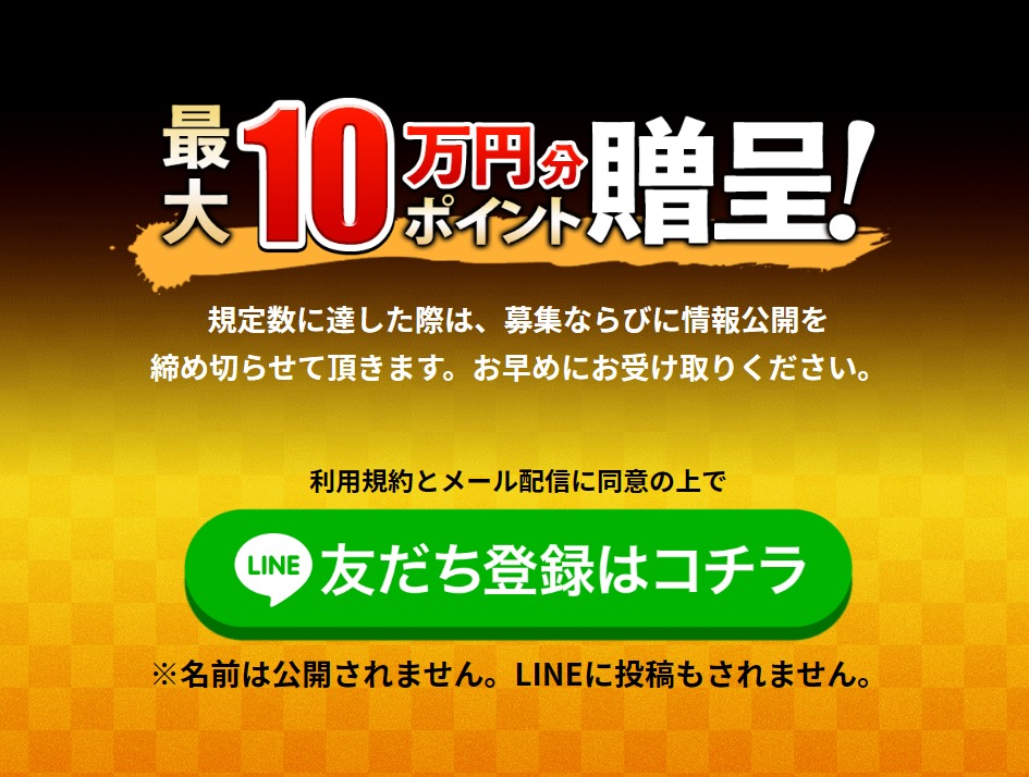 - 初回特典として1万円分のPT「100pt」が登録時にプレゼントされる